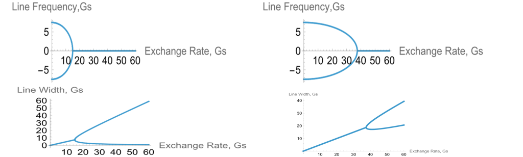 - В случае неэквивалентного спинового обмена эффект обменного сужения спектра может и не проявляться. На кривых справа видно, что в отличие от ситуации эквивалентного обмена (кривые слева на рис.1), в условиях коллапса спектра обе линии продолжают уширяться с ростом Vex. В случае неэквивалентного спинового обмена в условиях коллапса спектра одна из линий уширяется с меньшим наклоном, чем другая (ср. рис.1а,1б).