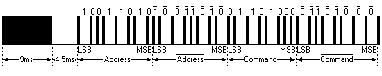 Первым идёт стартовый импульс длительностью 9 ms, после которого следует пауза длительностью 4.5 ms. Затем передаются 32 значащих бита (4 байта) младшим битом вперёд. Первый байт – адрес, второй байт – инвертированный адрес, третий байт – код команды, четвёртый байт – инвертированный код команды.