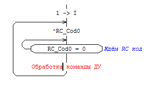 После приёма каждого «кода повтора» RC_Cod0 копируется в RC_Cod1. Такой простой приём позволяем реализовать нам два режима опроса канала ДУ. Дело в том, что даже короткое нажатие на кнопку пульта сопровождается несколькими «кодами повтора» (с периодом 110 ms). Для того чтобы не загромождать программу процедурами типа «подавление дребезга контактов» в тех случаях, когда нам нужно зафиксировать только сам факт нажатия на кнопку, используется переменная RC_Cod0. В общем виде алгоритм опроса канала ДУ выглядит следующим образом: