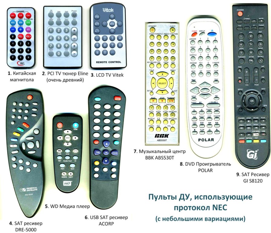 С помощью простой тестовой прошивки я проверил все пульты, которые попались мне под руку. У брендовых пультов (Sony, Panasonic, LG, Hitachi и др.) свои протоколы, а вот вся остальная масса использует один и тот же протокол. Благодаря китайским товарищам самым распространённым протоколом оказался протокол NEC. Пульты, которые я проверил: